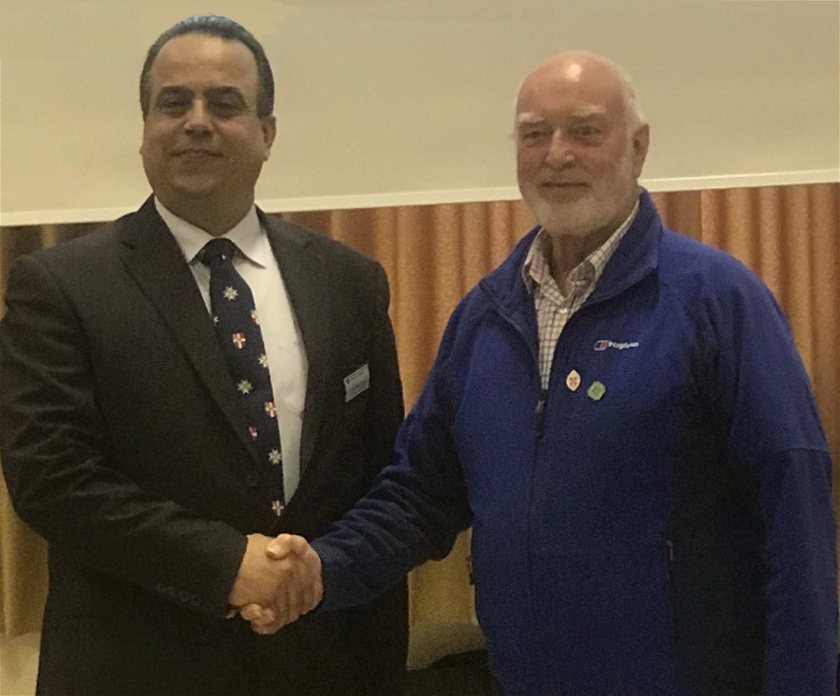 At the recent Regular and Installation meeting of Temple Bruer Preceptory No.143, E.Kt. John Hudson, the newly installed Preceptor, presented a £300 cheque for the Jerusalem Eye Hospital, to the Provincial Prior, Right Eminent Knight Malcolm Bilton KCT.