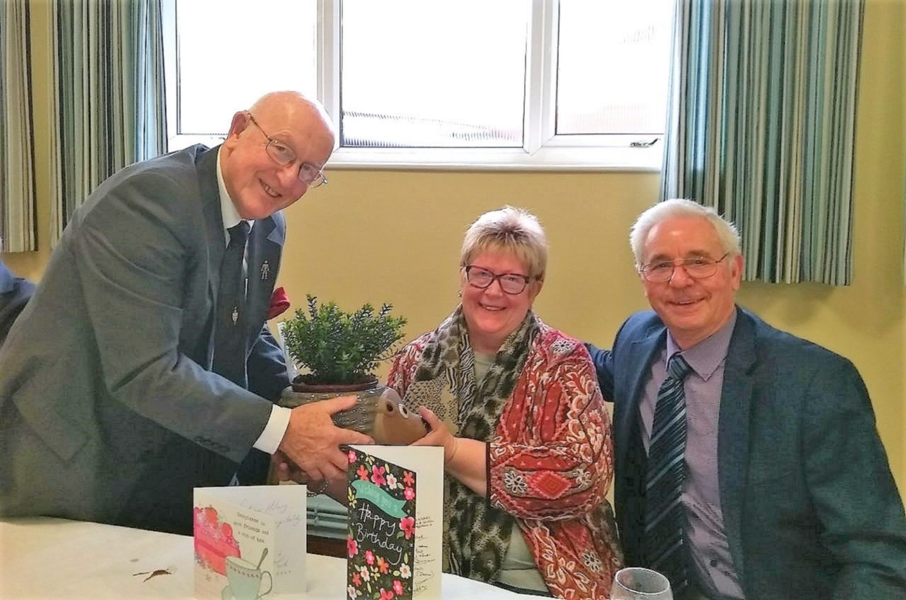As coffee was being served, Kt Keith Appleton called attention to the Provincial Sub-Prior, V E Kt Terry Aldridge. Terry informed everyone that, today was Mrs Hilary Carter's birthday. He went on to give a most eloquent speech, saying that everyone here was constantly thinking of Hilary during her treatment and how delighted we were to see her looking so well. He then presented Hilary with a birthday card, signed by everyone and a Hebe in a hedgehog planter. Hilary thanked everyone for their good wishes and friendship.